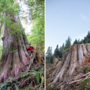 Two days earlier, the Ancient Forest Alliance (AFA) released dramatic before and after photographs of massive cedar trees on Vancouver Island, where they were logged as part of a government-approved tree harvesting licence.