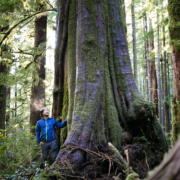 Endangered Ecosystems Alliance’s Executive Director Ken Wu beside a giant old-growth cedar tree in the unprotected Eden Grove near Port Renfrew in Pacheedaht territory on Vancouver Island, BC.