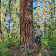 Endangered Ecosystems Alliance executive director Ken Wu stands beside an old-growth Ponderosa pine in the South Okanagan Grasslands Protected Area in Syilx territory.