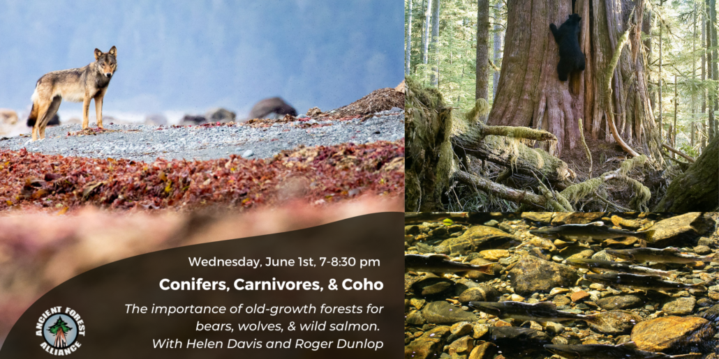 Join us on Wednesday, June 1st from 7-8:30 pm PDT for our old-growth and wildlife webinar “Confiers, Carnivores, & Coho: The importance of old-growth forests for bears and wild salmon”.