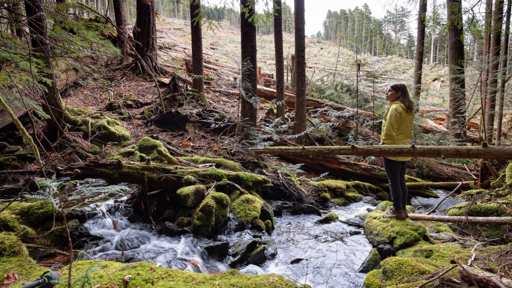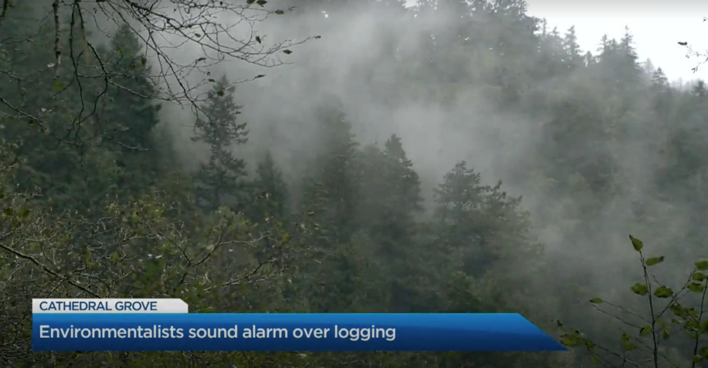 clearcutting on the mountainside above Cathedral Grove, featuring AFA's Andrea Inness.