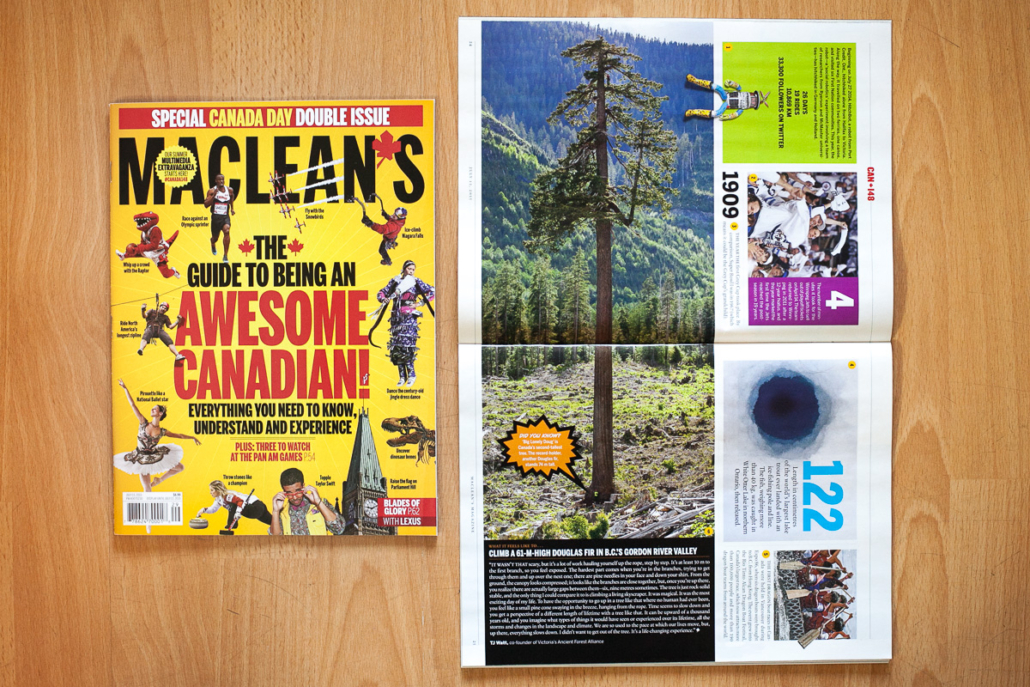 MacLean's magazine has featured a photo by the AFA's TJ Watt. This shot of Big Lonely Doug was captured during the tree climb and featured in the July 2015 'Guide to Being an Awesome Canadian'!
