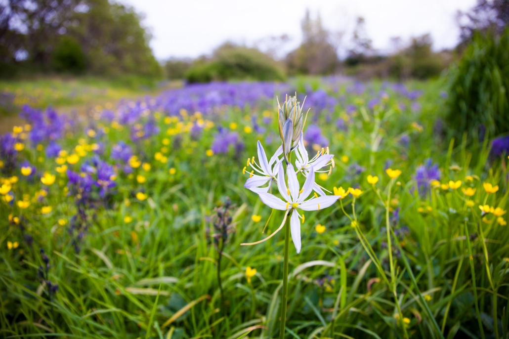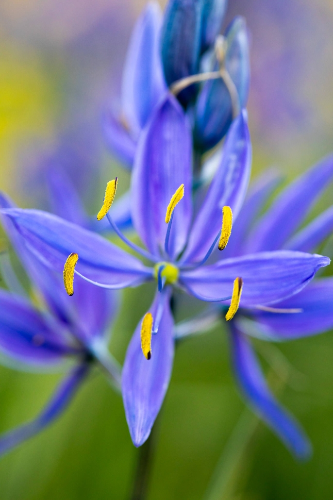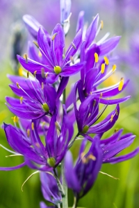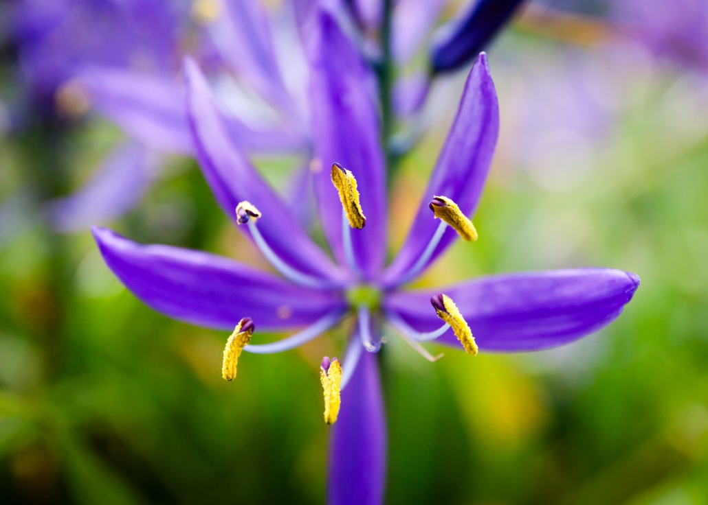 There are two species of blue camas on Vancouver Island — the common camas and the great camas — separated by size and the arrangement of the petals, which on the great camas twist together. Neither should be confused with death camas though, a white flowering species with bulbs that can be lethal to consume.