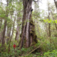 TJ stands beside a massive redcedar tree growing unprotected adjacent to the cutblock in Quatsino Sound.