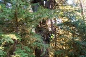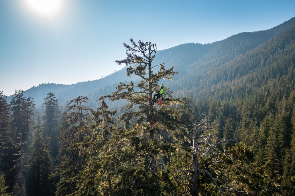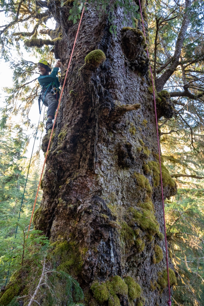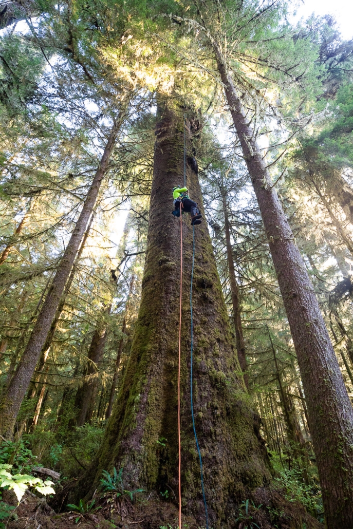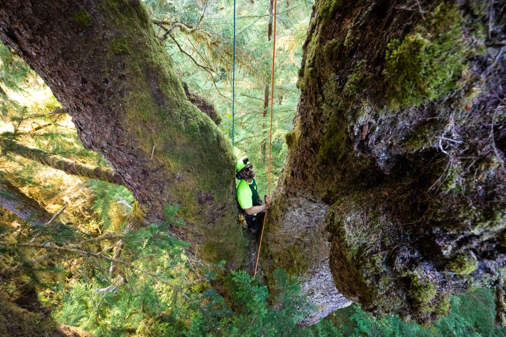Climber Will Clayton of Bartlett Tree Experts begins his ascent up the towering trunk of the largest spruce tree in the Carmanah Valley in Ditidaht territory on Vancouver Island, BC.