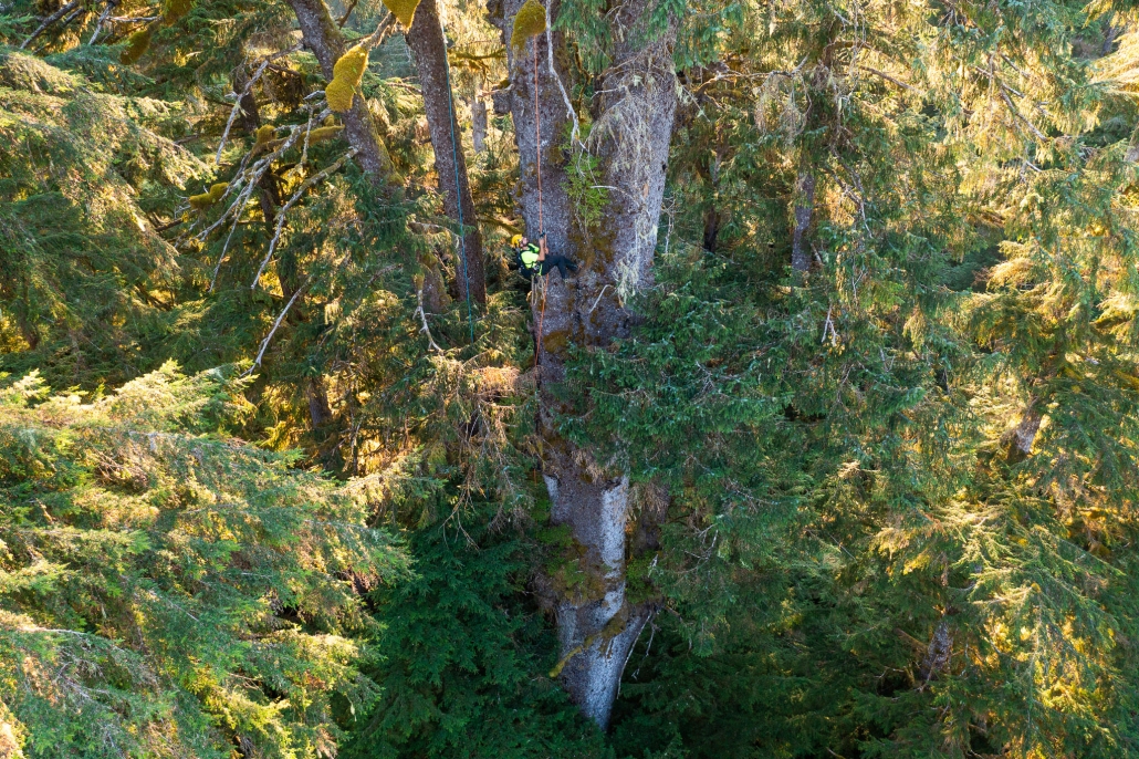 Spectacular drone footage and photos reveal climbers more than 20 stories in the air in the “hydra-like” canopy of an old-growth Sitka spruce, highlighting the incredible grandeur of old-growth forests in British Columbia during Earth Week.