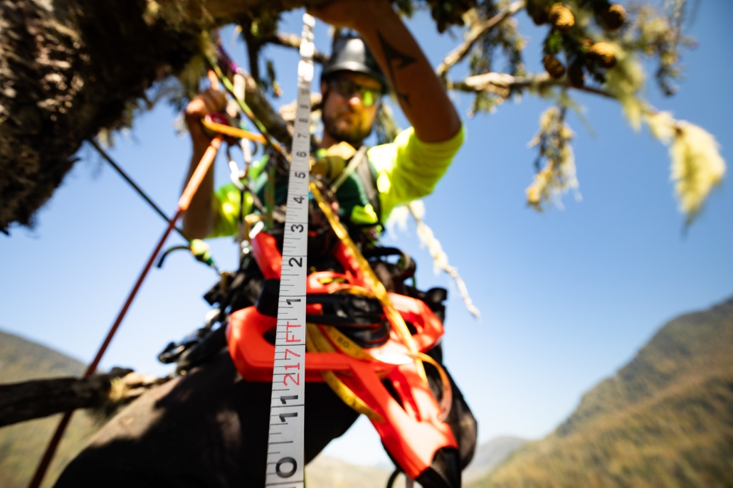 AFA later teamed up with professional arborists from Bartlett Tree Experts to ascend, document, and measure the ancient tree. Using a 12-foot “Big Shot” slingshot, the team fired a line over a large branch high up into the canopy. Then, using low-impact techniques where climbers ascend the ropes themselves rather than the tree’s trunk, they could reach within a few meters of the top of the tree. Lowering down a giant tape measure, they calculated a height measurement of 233 feet or 71 meters tall — as tall as a 21-story building.