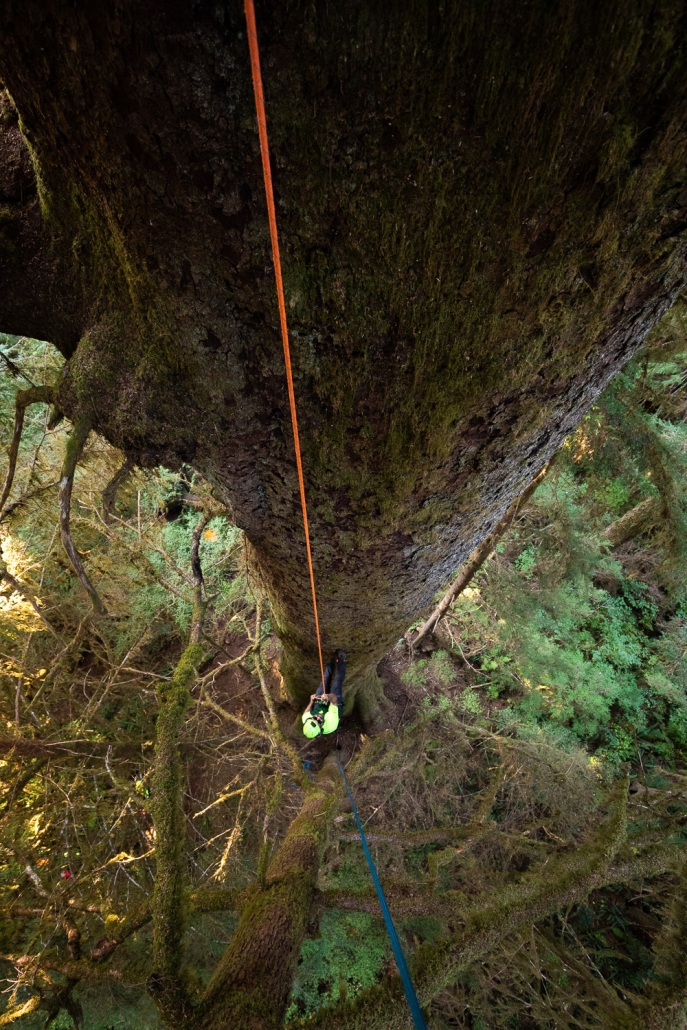Climber Finn Rowlands dangles among the massive canopy of the Hydra Spruce during golden hour. All five trunks visible in this image are part of the same tree.