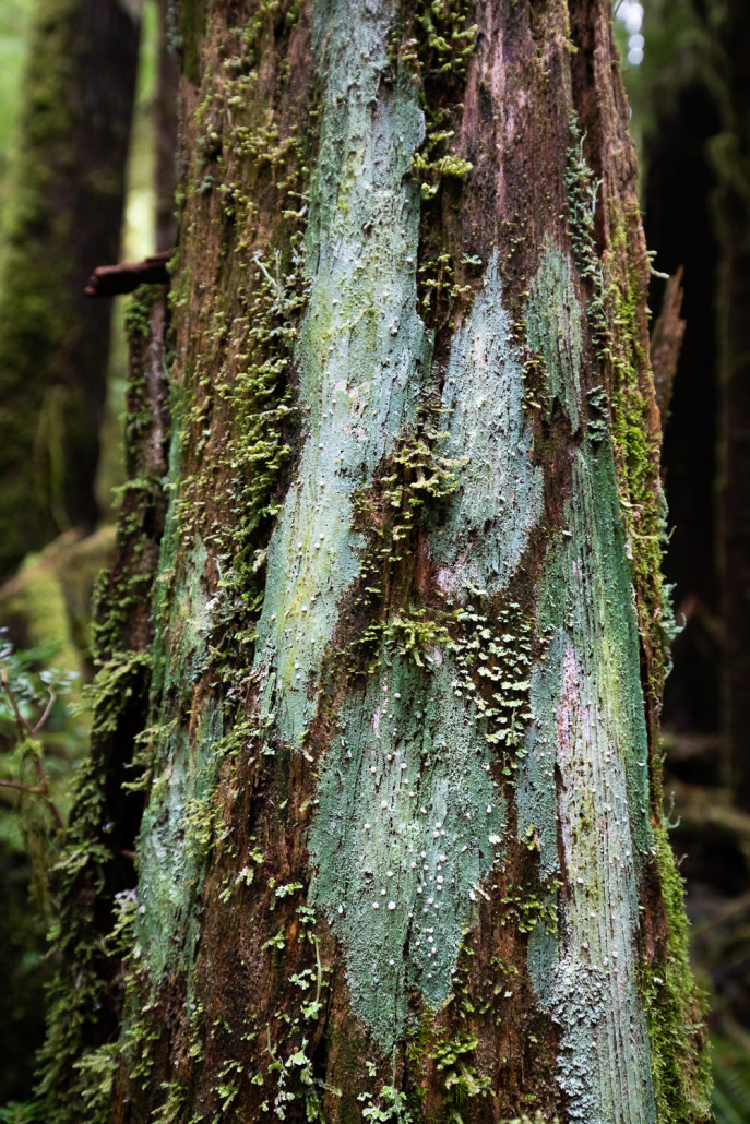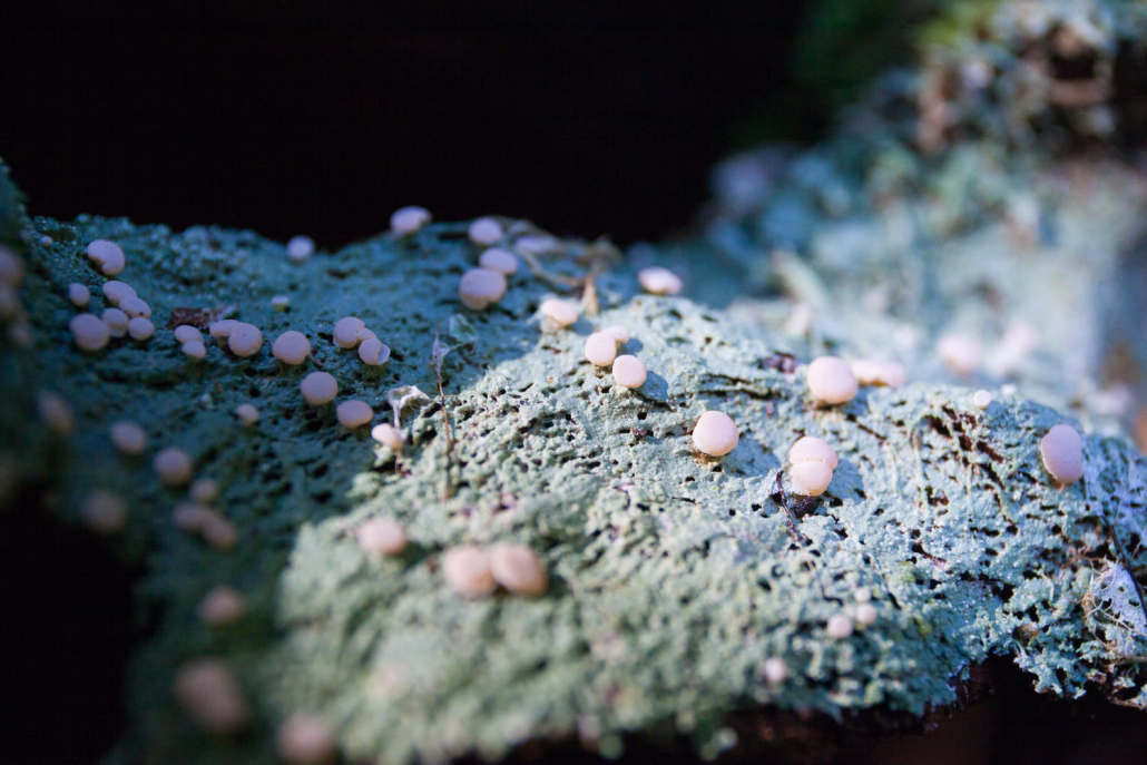 This lichen thrives on rotting logs in shaded and damp places. The green carpet is the lichen’s thallus which roughly corresponds to a plant’s leaves, whereas the pink globes (or perhaps “chunks”) are called apothecia and release reproductive spores, corresponding roughly to the fruits and flowers of a plant.
