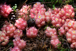 The lack of leaf or any trace of green on the gnome plant reveals that this is a myco-heterotroph: a strange guild of plants that includes the ghost pipe and groundcone that do not photosynthesize like other plants. Rather than spinning its own sugars from sunlight, the gnome plant taps into the complex network of mycorrhizal fungi under the forest floor and steals the solar energy they’ve traded from the trees. A beautiful parasite!