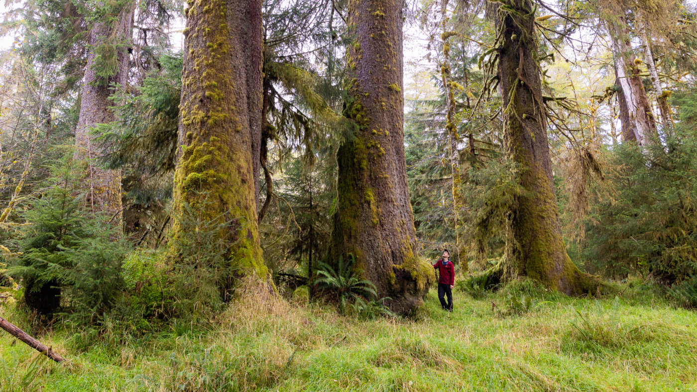 In one unique area, TJ came across an old-growth Sitka spruce meadow that felt like entering a vast golden hall, where giant trees rose like ancient pillars above grassy glades. Hundreds of massive, moss-cloaked trunks glowed in every direction. It was one of the most beautiful sights he’d ever seen!
