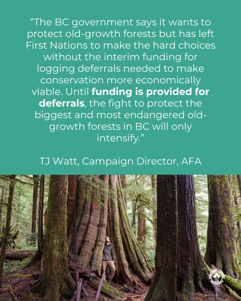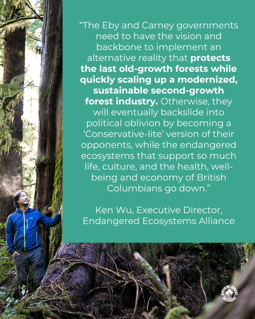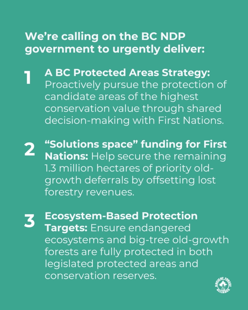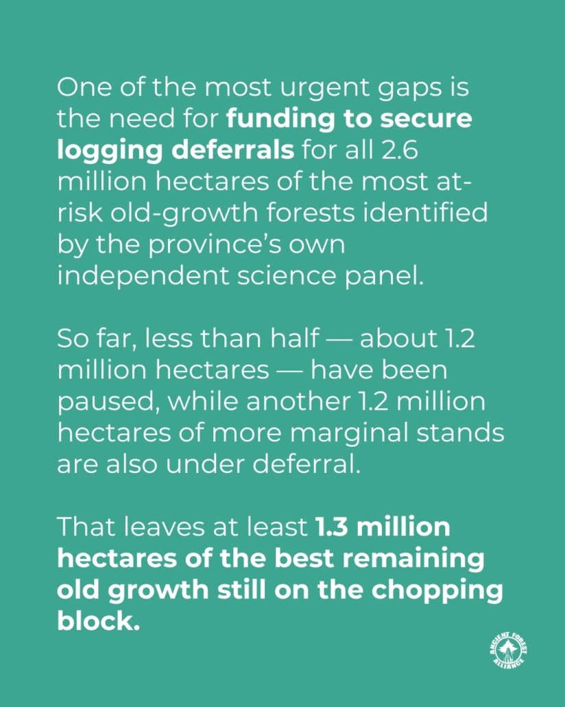 - “Solutions space” funding for First Nations: Help secure the remaining 1.3 million hectares of priority old-growth deferrals by offsetting lost forestry revenues.