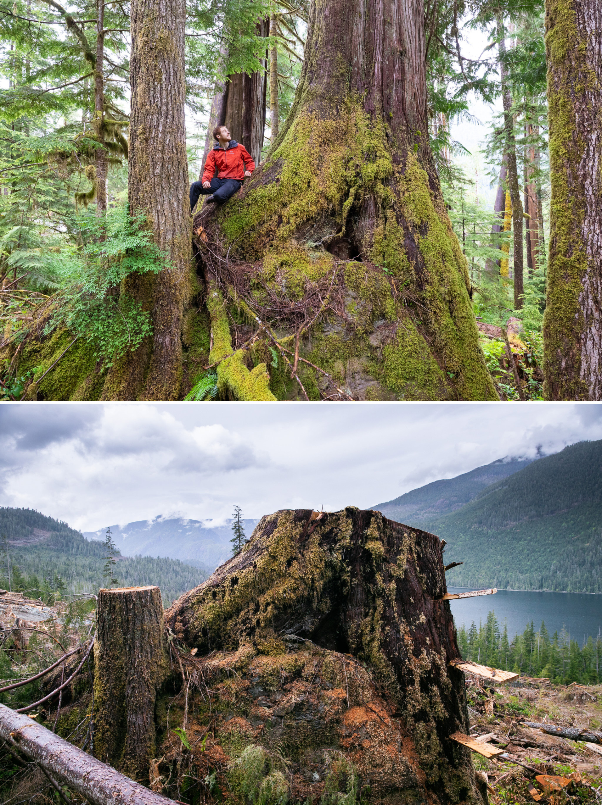 Ancient Forest Alliance photographer and campaign director TJ Watt stands beside an ancient western redcedar before and after it was cut down by BC Timber Sales in the Nahmint Valley near Port Alberni in Hupačasath, Tseshaht, and Yuułuʔiłʔatḥ First Nation territory.
