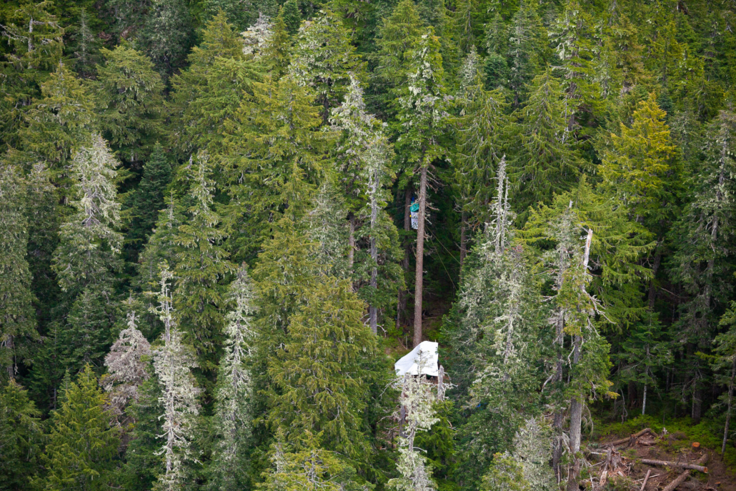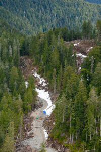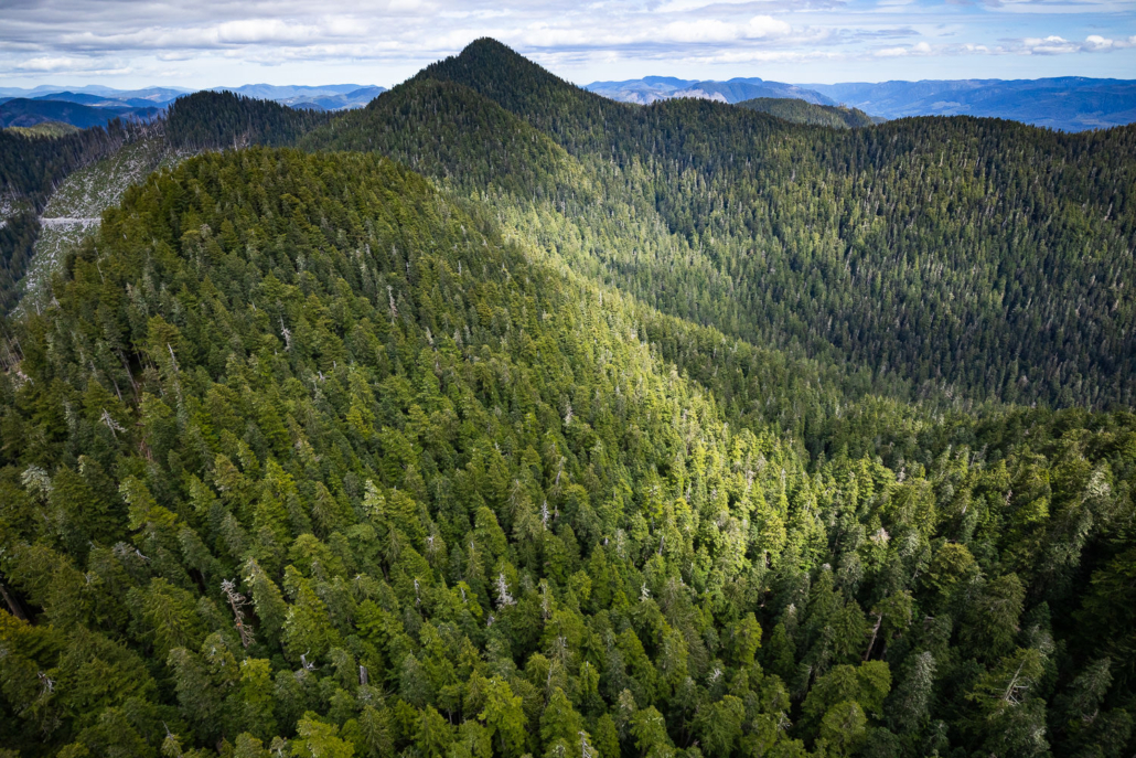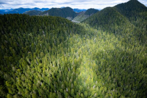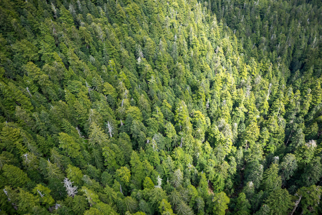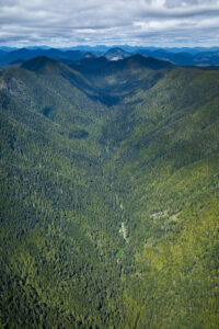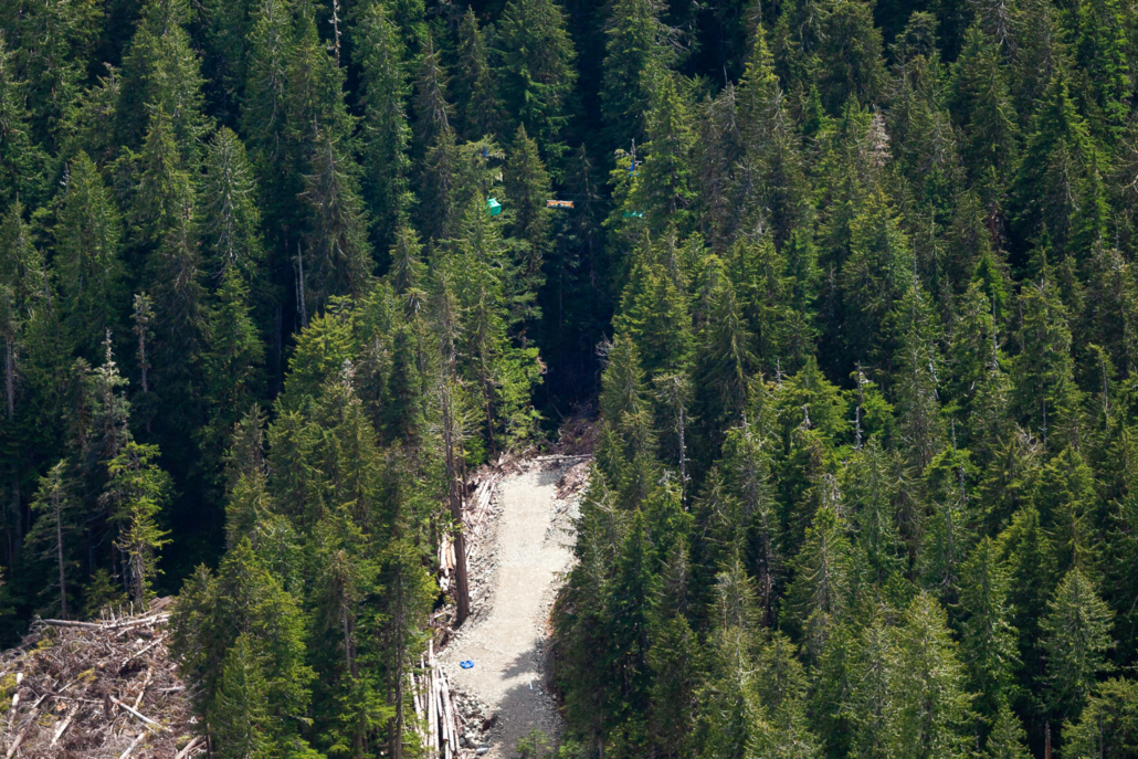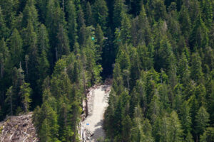 The emerald-green ancient forests of the Fairy Creek Valley in Pacheedaht territory from above. Last week we took to the skies to document old-growth forests and logging across the west coast of Vancouver Island and, when you’re in the air, it’s clear just how incredibly rare a sight this is – a roadless valley free from clearcuts. But how long will it remain that way?