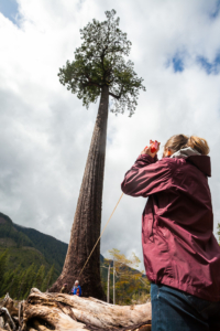 Big Lonely Doug was identified in early 2014 by Ancient Forest Alliance campaigners as the second-largest Douglas-fir tree in Canada. Prior to logging, the tree was once a part of the endangered Eden Grove that still stands unprotected next door. Dozens of massive redcedar and Douglas-fir stumps were scattered throughout this clearcut, evidence of the once grand forest that would have originally surrounded Doug.