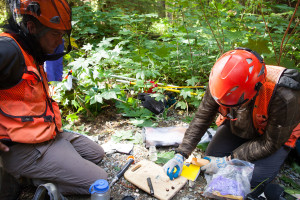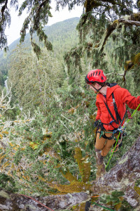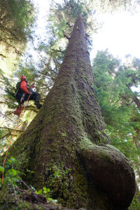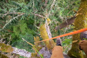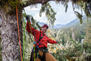 One weekend in July 2016, Ancient Forest Alliance photographer TJ Watt joined a team of professional tree climbers and researchers in the Carmanah Valley to assist UBC Forest and Conservation Sciences student Vincent Hanlon in his research on somatic mutation in old-growth trees. The climbing team, consisting of James Luce, Matthew Beatty, and Ryan Murphy, used low-impact rope techniques to access and sample the highest possible new growth points in each tree, record specific sample location data, and measure both the sample height and ultimate tree height. Over the course of seven days, they ascended 23 Sitka spruce trees that averaged heights of 250 feet or 75 meters tall, with the tallest (and largest by volume) measuring 84 metres tall. The photos were captured in the Randy Stoltmann Grove. Thank you to Vincent Hanlon, Jon Degner and Sally Aitken at UBC Forestry for this rare and extraordinary opportunity and to the climbers for once again making access to this rarely-seen world possible.