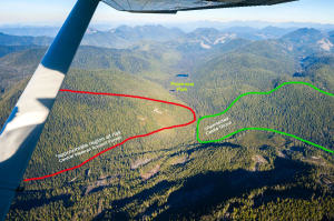 The flagged areas were generally to the southwest of the “Miller’s Monstrosity” clearcut, with some flagging on its north side as well. After a major public uproar, logging licensee Teal Jones only applied for one of the cutting permits, which was granted by the Ministry of Forests but never cut.