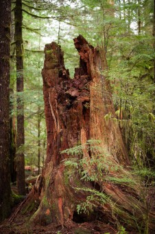 This little lake, just outside of the Walbran watershed on southern Vancouver Island in Ditidaht & Pacheedaht territory, is ringed with beautiful and majestic old-growth temperate rainforest. The massive standing and fallen logs (like the giant Sitka spruce snag), multitudes of dense, towering giants, and sheets of hanging mosses everywhere are so grand here that they resemble the famed forests of the Olympic Peninsula in Washington State.