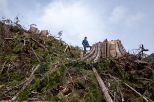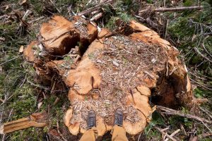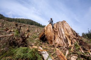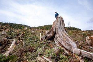 The giant cedar stumps are a testament to the magnificent forest that once stood here. One of the quickest ways the BC government could help implement greater protection for old-growth forests would be to stop issuing cutting permits for them in BCTS tenures and support local First Nations with conservation financing that supports sustainable economic alternatives to old-growth logging.