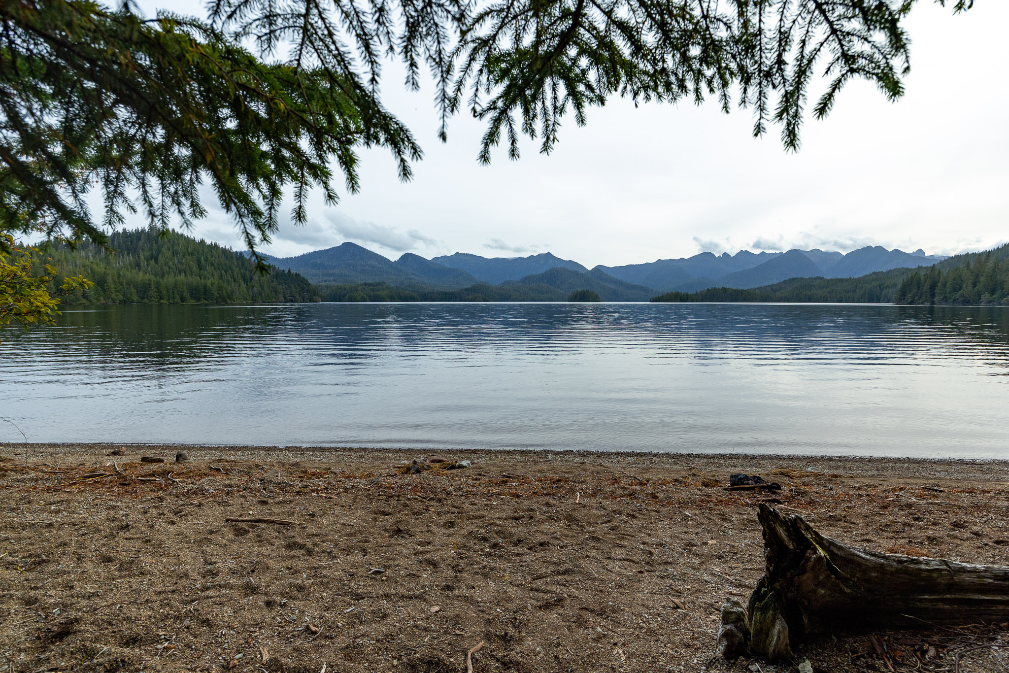 A short 1.5-kilometre trail (800 m one way) leads through towering trees reaching over 230 feet (70 metres) tall and 11 feet (3.5 metres) wide before opening onto a quiet sandy beach at the lake. The lake is about a 40-minute drive along logging roads from Daajing Giids. Take Queen Charlotte Mainline to Rennel Sound FSR, then go left here before parking at the trailhead.