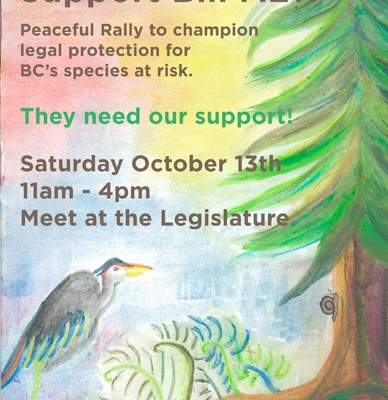 Youth from Cortes Island, BC are hosting an educational rally on the legislative grounds in Victoria this coming Saturday, October 13 from 11 am – 4 pm. Forest lands on Cortes Island threatened by industrial logging prompted the youth to research out what protection, if any, was afforded the numerous species at risk making these forest lands their home.