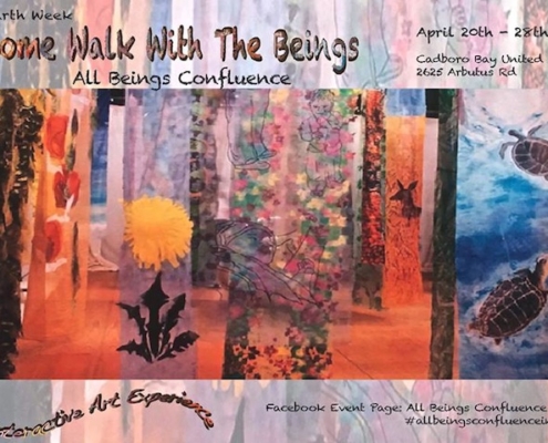 All Beings Confluence, hosted by the Cadboro Bay United Church in Victoria, is an expanding fabric art installation created by many individuals from multiple communities and local organizations. This project uses community art, collaborative practices and a belief in the creative process to explore the idea that all life is interconnected and each “living being” plays a vital role in sustaining the web of life. The event will also help to raise awareness and support for the Ancient Forest Alliance, the Victoria Immigrant and Refugee Society (VIRCS), and The Learning Curve. See details and invite others on Facebook HERE