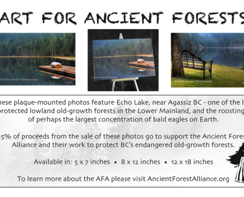 The Ancient Forest Alliance would like to recognize Vancouver-based photographer Karen Cooper for her support for the AFA through sales of her beautiful plaque-mounted photographs of Echo Lake. A huge thanks for Karen for her continued creative support!