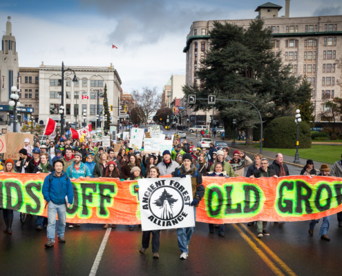 About 500 people in a diverse crowd of conservationists, forestry workers, First Nations, business owners, and union members showed up today in the heavy rain in Victoria for a rally organized by the Ancient Forest Alliance. Despite the morning downpour, spirits were high, and the clouds parted as the protesters marched their way towards the BC Legislative buildings from Centennial Square.