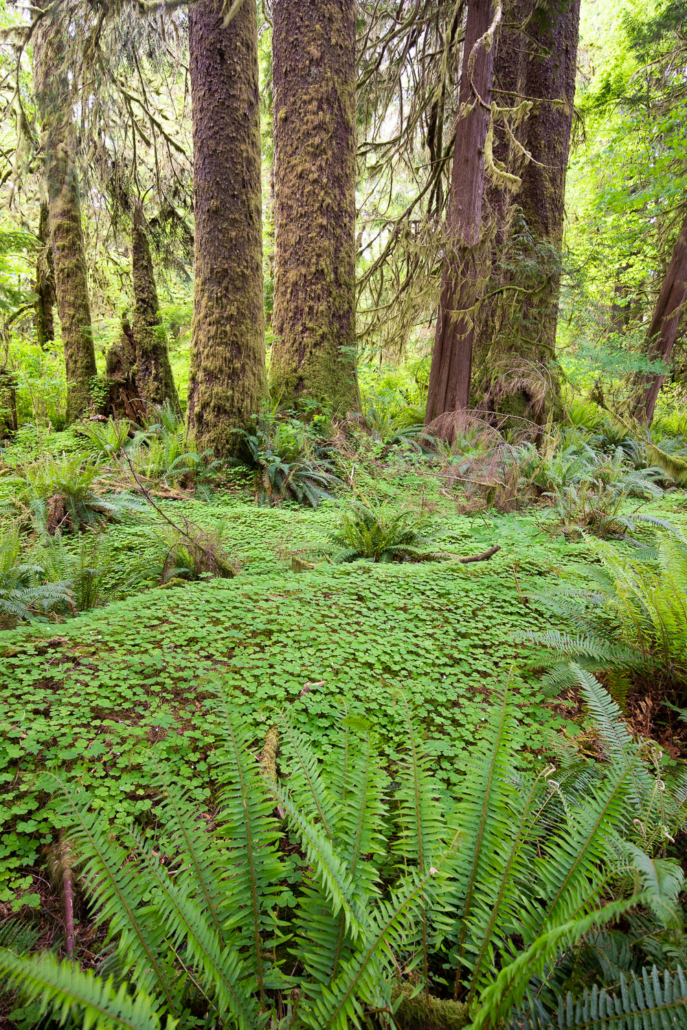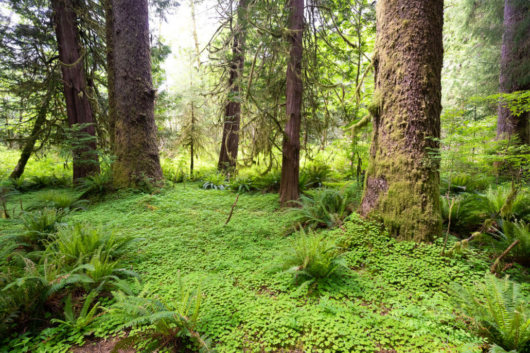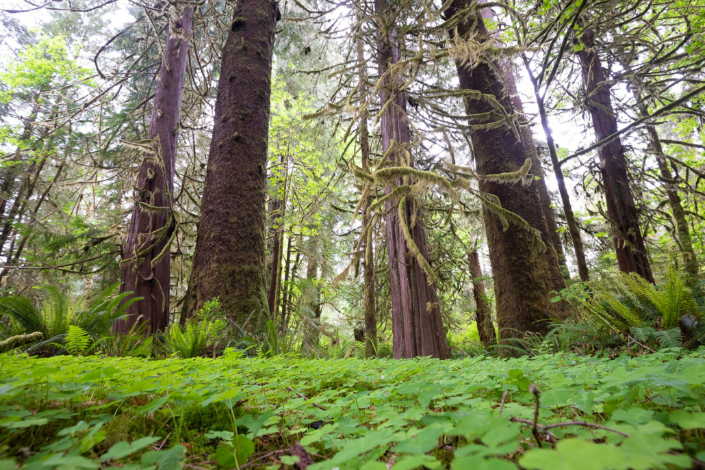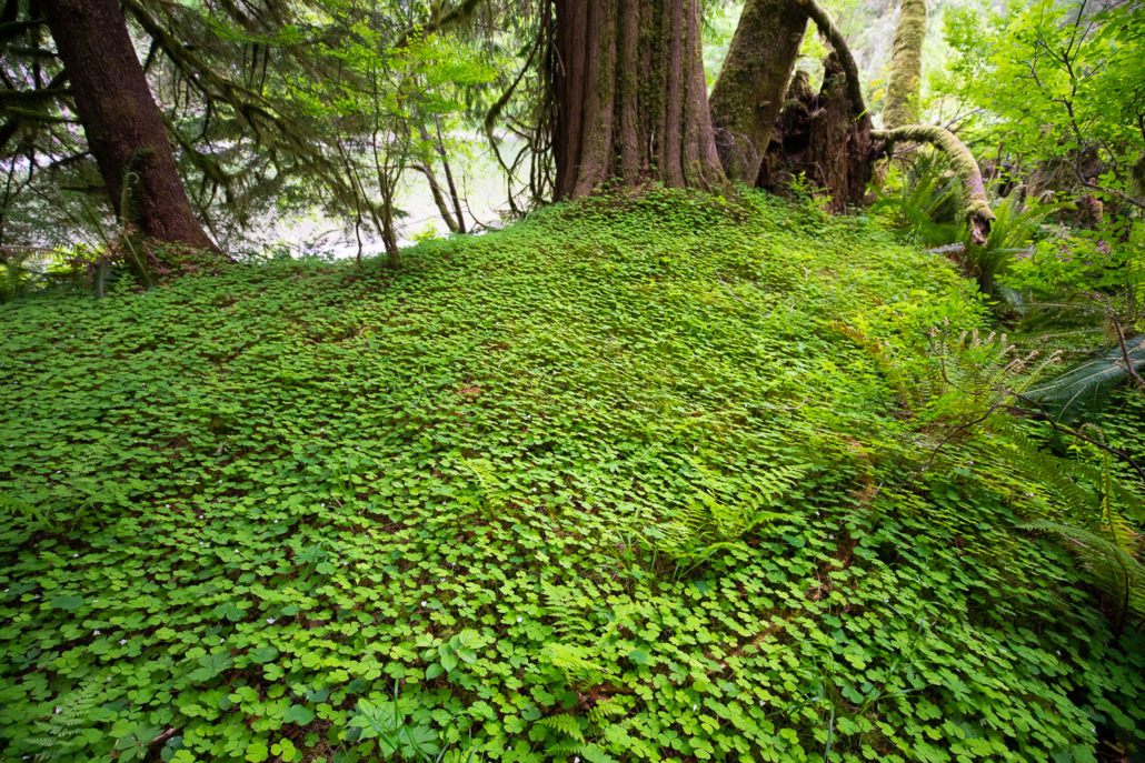 On Vancouver Island, these exceedingly rare old-growth sorrel gardens reach their most magnificent expression in the Klanawa Valley in Huu-ay-aht territory. In these enchanted groves along the banks of the Klanawa River, delicate carpets of sorrel flowers and fairybell lilies are braided with wildlife trails made by Roosevelt elk, black bears, and coastal wolves, giving the impression of a manicured garden and trails deep in the rainforest. The idyllic forest scenes here are among the most beautiful we have ever encountered.