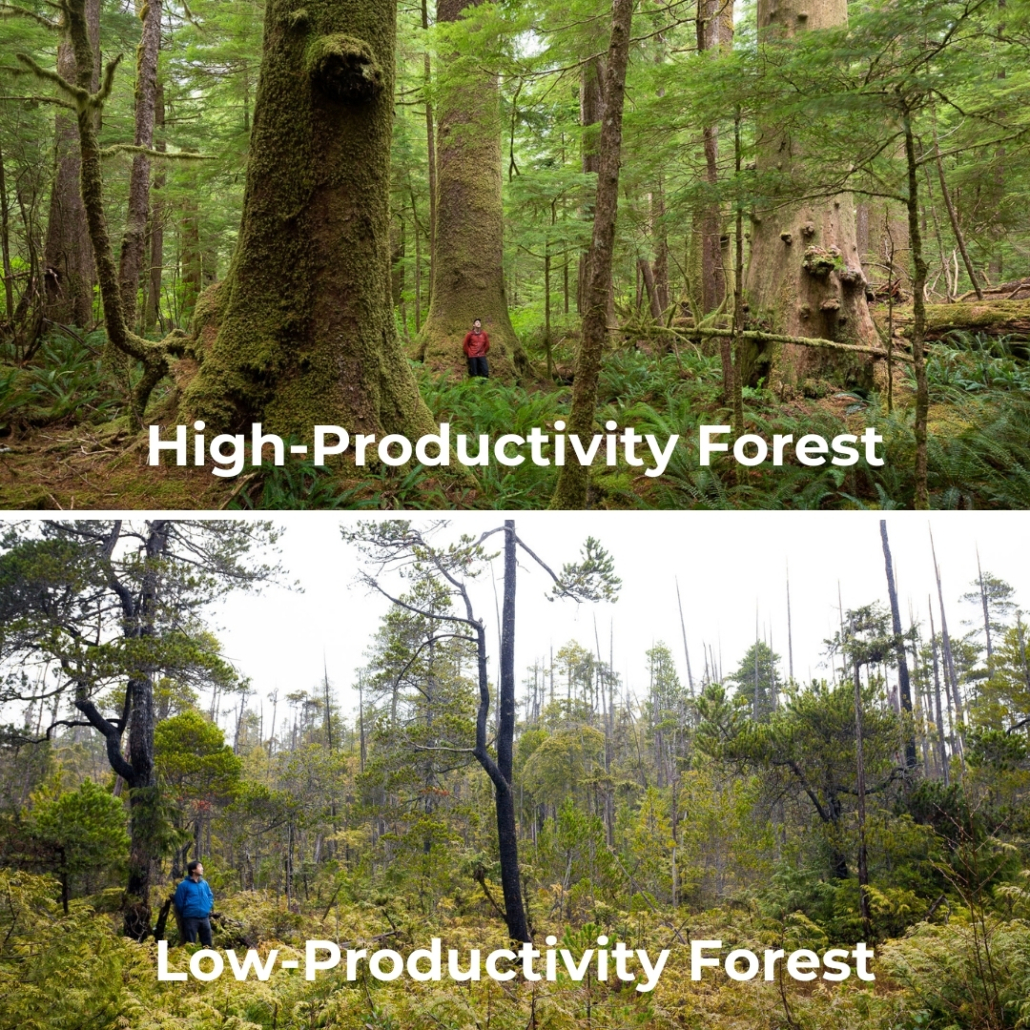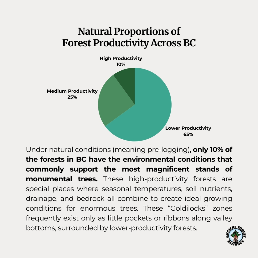 “Forest Productivity” refers to the capacity of the forest to produce large trees, with the endangered, higher productivity forests generally featuring the giant ancient trees that BC is famous for.