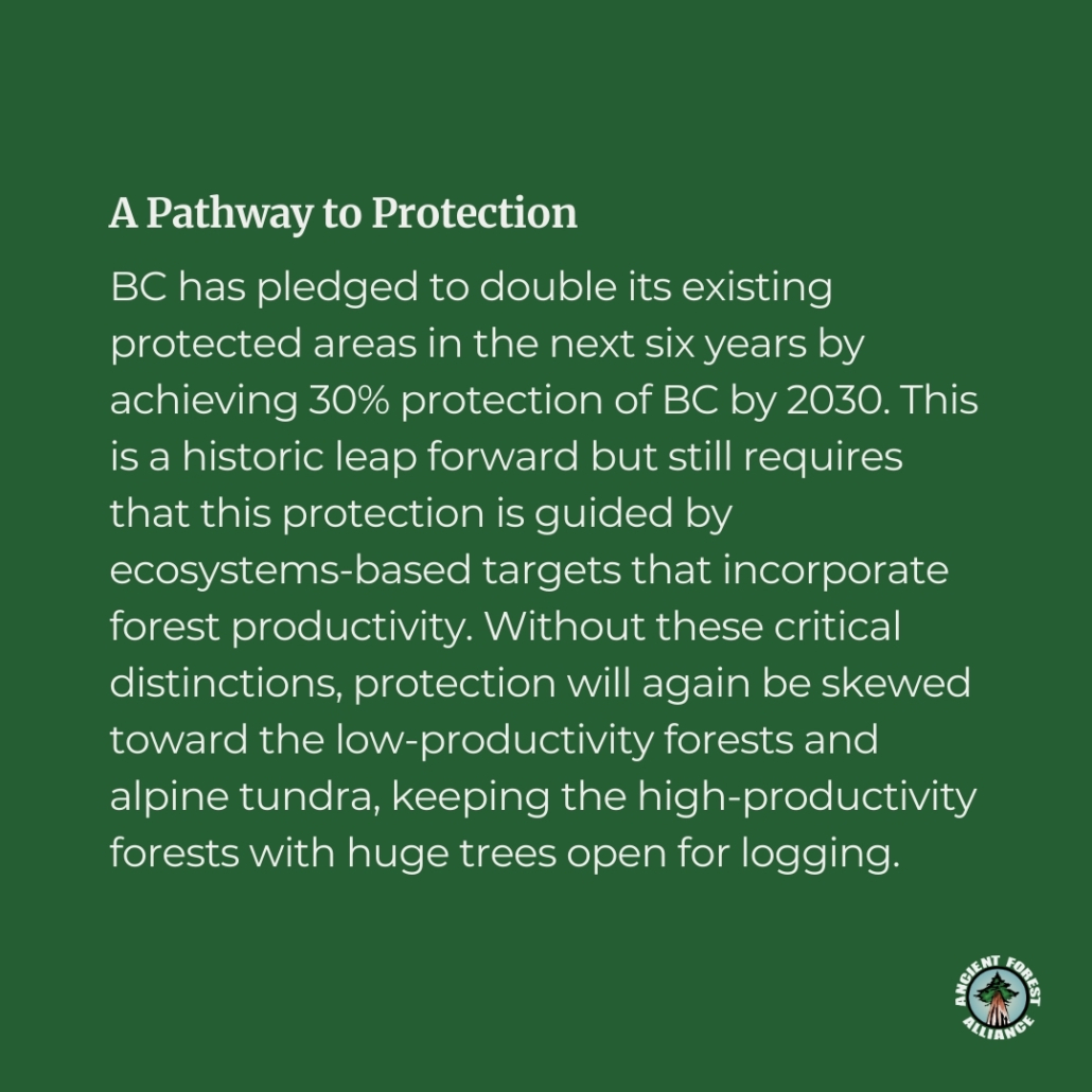 Ecosystem-based targets used in conjunction with forest productivity distinctions ensure the ongoing expansion of protected areas in BC prioritizes the endangered, big-tree forests, rather than focusing protection on the boggy, subalpine, and tundra ecosystems of the province. The latter of which has been the status quo for decades.